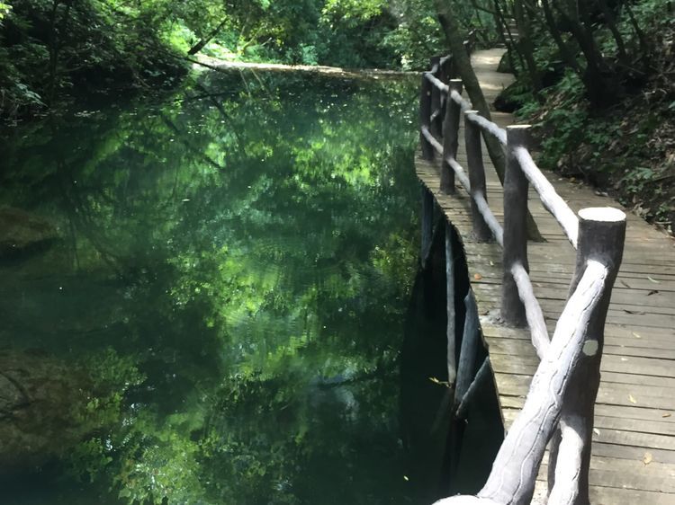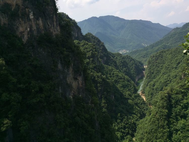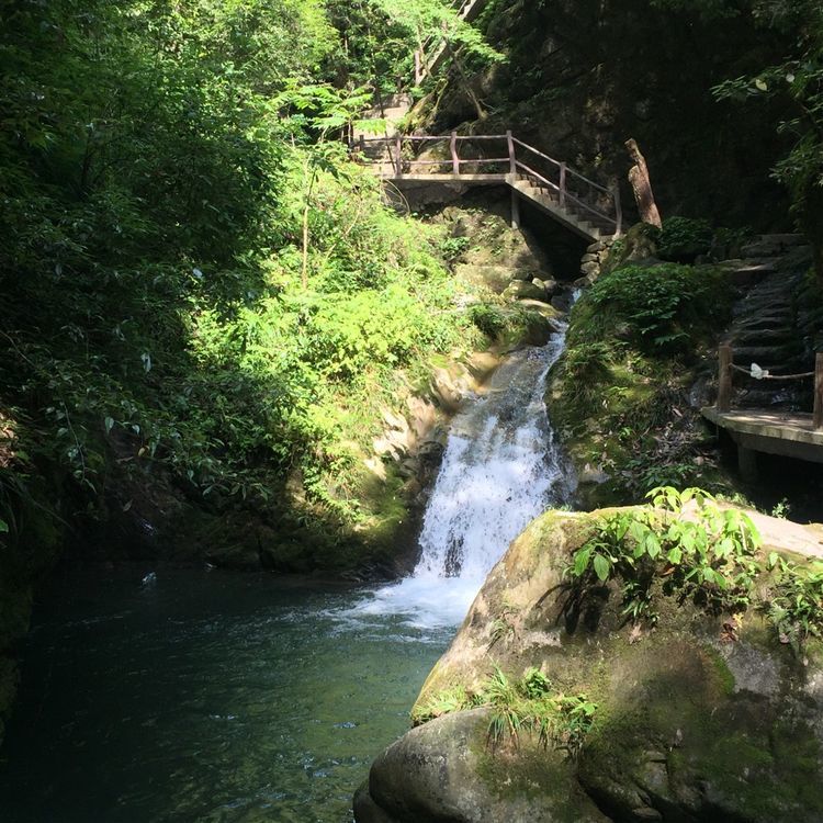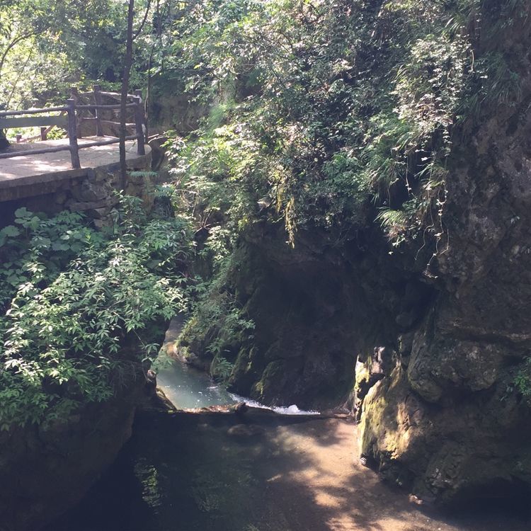 漫步在林间栈道,清新的空气迎面扑来,山谷的清风徐徐吹着,游荡在山涧,在大自然的空调下,它们像是在欢迎久别重逢的好友一样。仔细闻一闻那新鲜的空气中散发着岩屋沟独有的清香,隐约还流露出森林特有的气味,那是一种淡淡的,令人神清气爽的甜味。愈往深处走,这种清香就愈发浓郁。崖壁边的崖柏,岩松的香味那绝对是独有而特别的。树木静静地站在蔚蓝的天空下,在山崖谷底,张开双臂,迎接阳光。阳光像一缕缕金色的细沙,穿过重重叠叠的枝叶照进来,斑斑驳驳地洒落在栈道上。五六公里的栈道,处处让我们惊喜不已!时而抬头只见一线天,不时会出现彩虹半挂,令人心旷神怡。时而是湍急的溪水,时而又是幽幽的深潭,飞叠成群的瀑布,令人目不暇接,无数的游客在此陶醉,留下无数的记忆,无数的尖叫声在索桥回荡,放眼望去,尽是高峡出平湖,桥下的碧水微澜,索桥上的人儿有扶着两边扶手而过的,也有匍匐前进的阿姨大叔,在笑声中前进。