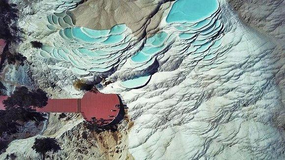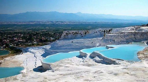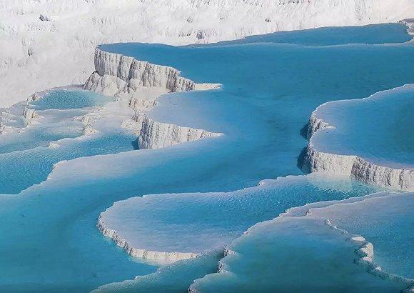 雪白棉花般奇异的丘陵,大大小小的雪白丘陵如棉花团般堆积,一方方温泉小池像镜子一样光亮,映照着蓝天白云。土耳其棉花堡,可谓是万千少女的梦想之地。
