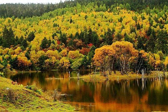 千湖山的湖泊像是一颗颗宝石散落在了茫茫的原始森林中。这些湖形状各异,周围被高大笔直的冷杉、云杉所覆盖。