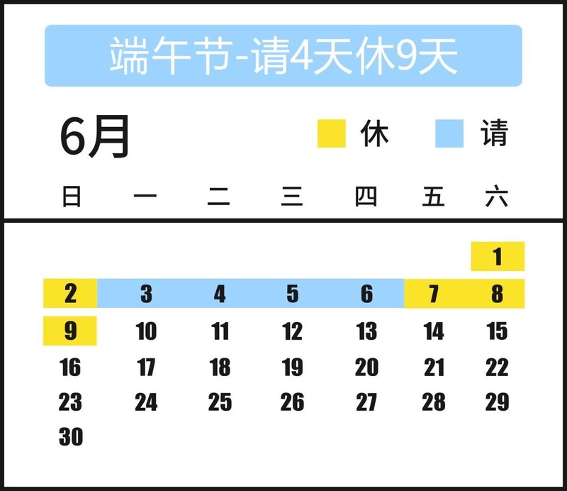 拼假攻略:周末2天+请假4天+端午3天=玩9天