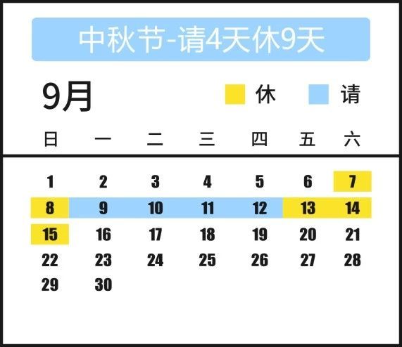 拼假攻略:周末2天+请假4天+中秋3天=玩9天