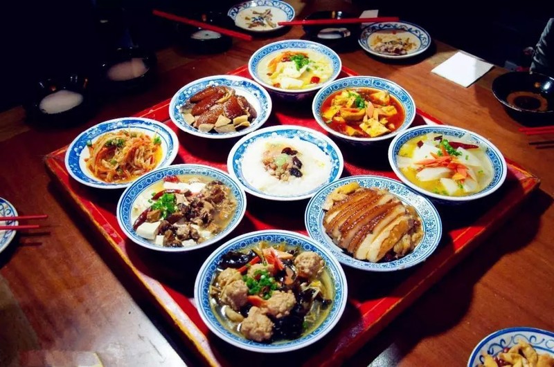 农村九大碗为猪肉墩子两碗、丸子、蒸菜为主菜,酥肉、粉条、海带、木耳等为佐菜。庙会、香客、寺院用素席,以植物油为原料,油炸豆腐、瓜薯为主。
