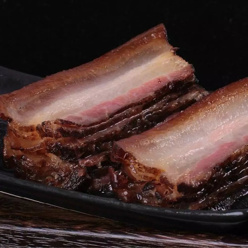 海螺沟内卖自制腌腊肉的地方很多,通常每块腊肉割成3~4斤重一块,穿以棕叶挂绳覆于大锅内或缸内,层层施粉盐盖上,腌至3~5天取出挂于室内或土楼内,表面抹盐后用核桃壳、柏枝叶点火,置肉于上,以烟熏之,晾于通风之处,风吹干后收藏。