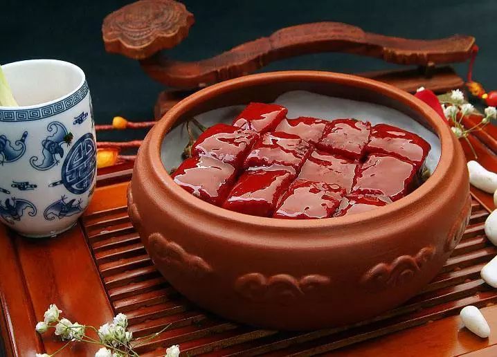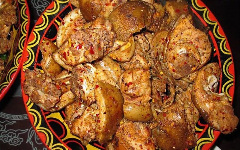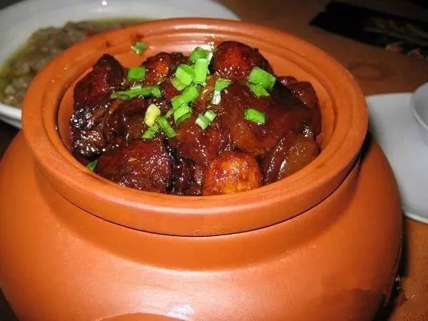 新鲜猪肉过油七分熟后连同油一起置放与土坛罐内,食用时取出连同青椒或蒜苗进行煎炒,颜色鲜亮、肥而不腻,入口即化,是当地一道很有特色的佳肴。
