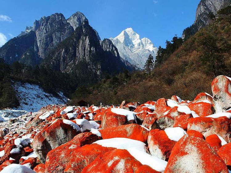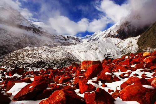 红石是大自然赠送给贡嘎山地区最珍稀的物种之一。在海螺沟、燕子沟、南门关沟、雅家埂等景区里分布着大面积的红石滩,每一块石头都被红色苔藓披上了一件美丽的红色外衣,红石在河流两旁堆积,成群的红石变成一种流动的红色,与清冽的流水相伴顺流而下,让人感叹大自然的神奇造化。