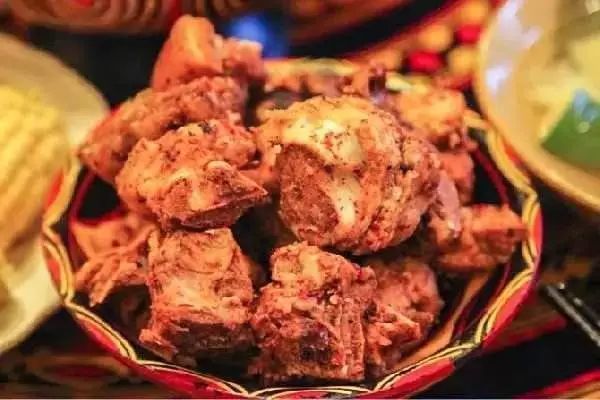 以磨西镇老百姓自产的土鸡为原料,用苹果木、桃木等香木先猛火去水,然后反复涂抹秘制的香料,最后利用木炭火慢慢烤制而成。烤鸡香脆入味,不油腻,是难得的一道美味。
