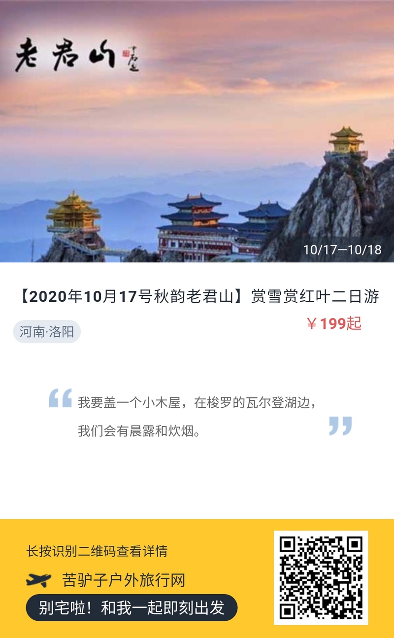 秋季的老君山色彩斑斓,因老君山生长着千年的枫叶树和黄栌柴,把老君山衬托的艳丽无比,一般10月中旬或者11月正是秋意浓的时候,9月中旬以后,树叶开始褪去翠绿,逐渐变成金黄,火红,从峰顶一点点的蔓延开来,如同妙曼的少女经过精心打扮,赶赴秋天的浓妆舞会