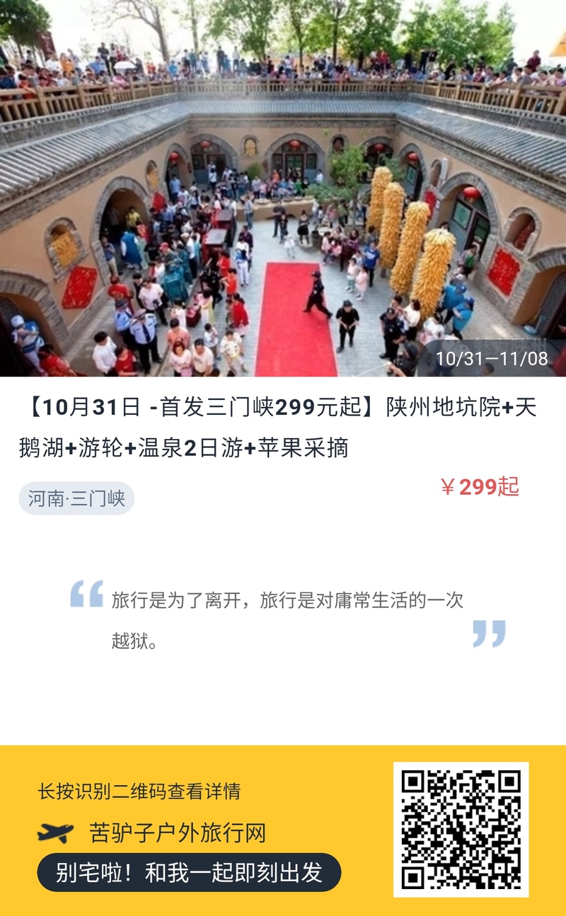 “见树不见村,进村不见房,闻声不见人。”在豫西的黄土高原上,有着这样一种民居形式:地坑窑院,它的整个村子都是在地下的,也就是你进去后看不到房子,因为全在地下,很有特色的一个民俗景点。