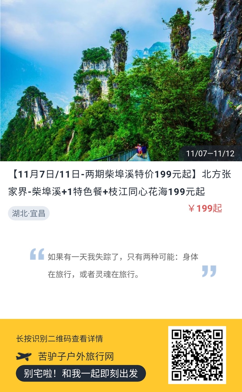 秋游柴埠溪,乘着缆车缓缓而上,漫山风景,尽收眼底。在你的眼神里,是苍翠的青松,是碧绿的流水,是灰白的巨石,是金色的银杏,是嫣红的枫叶。我想这大概就是最美的秋色了吧!如果你喜欢远足摄影,这绝对是您必去的地方之一!【11月7日/11日-两期柴埠溪特价199元起】北方张家界-柴埠溪+1特色餐+枝江同心花海199元起点击下图直接跳转行程细节