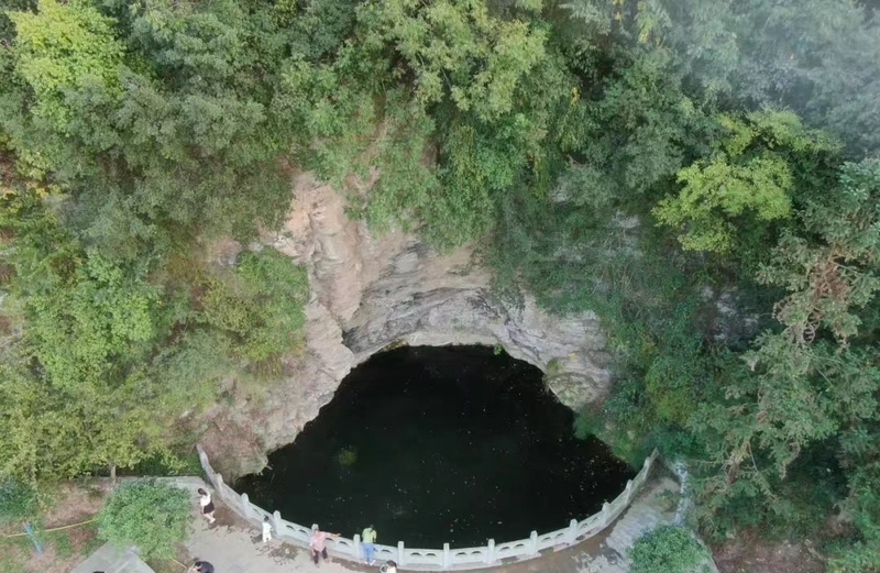 我们根据大姐的指导,转了一圈回到原地,结果在一个经过了两次的地方,不高的山麓下,一个紧挨岩壁、约70平方米的水潭出现在眼前。绿色水面点缀着浮萍,潭水深不见底。漆黑的水周围的阿姨说可以尝下,肠胃脆弱没有敢尝试。