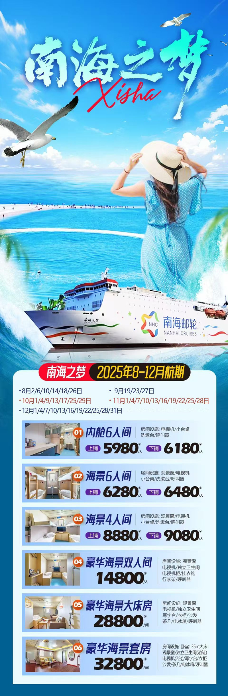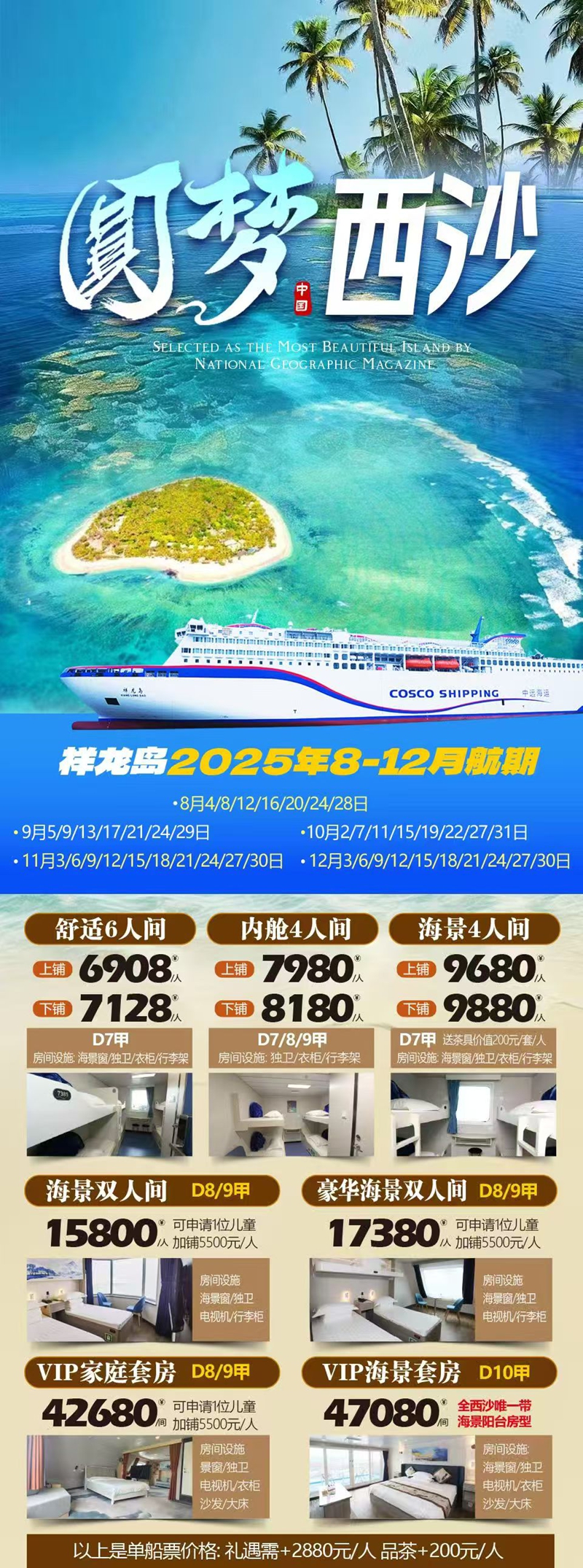 D2天,12月16日:“南海之梦”邮轮—西沙(全富岛、鸭公岛登岛活动,仅鸭公岛可以下水游泳),含早中晚餐,宿游。