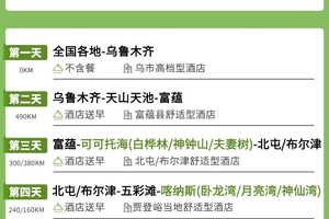 4:全程所有景点区间车不含。新疆的景区交通车价格变动较大,故全程区间车费用自理,参考价格:天山天池区间车60元/人、可可托海区间车26元/人、喀纳斯一进区间车70元/人、贾登峪-禾木区间车50元/人、禾木景区-禾木村区间车52元/人、世界魔鬼城小火车20元/人、赛里木湖区间车75元/人、薰衣草农场区间车20元/人、喀拉峻草原区间车70元/人、那拉提空中草原区间车40元/人、巴音布鲁克区间车75元/人、库木塔格沙漠小火车30元/人(以景区最新价格为准)。