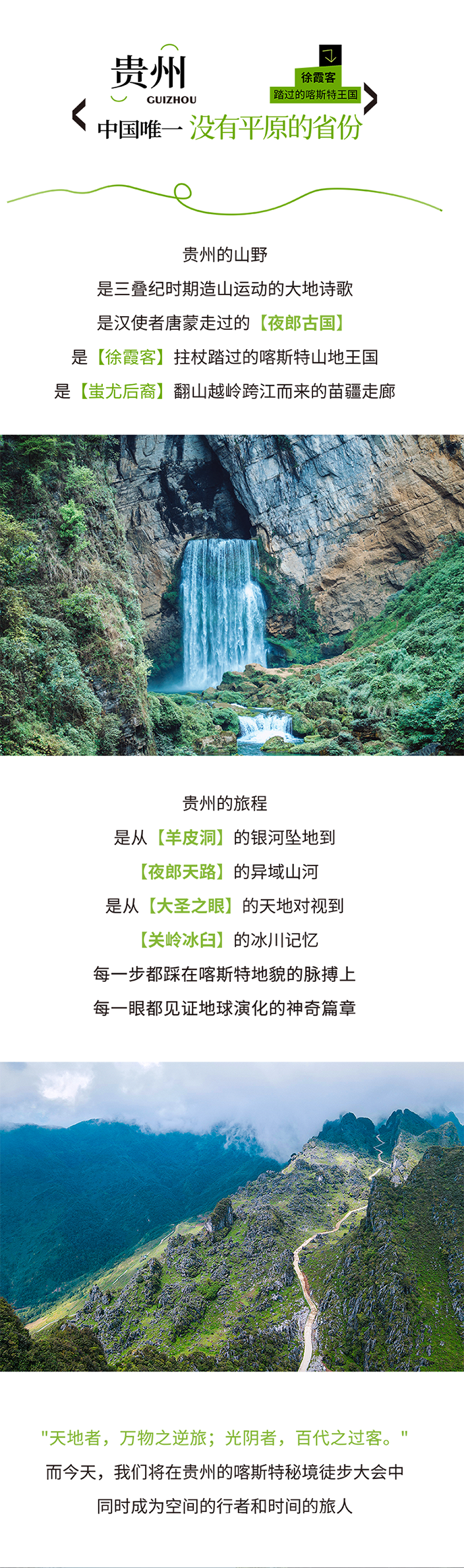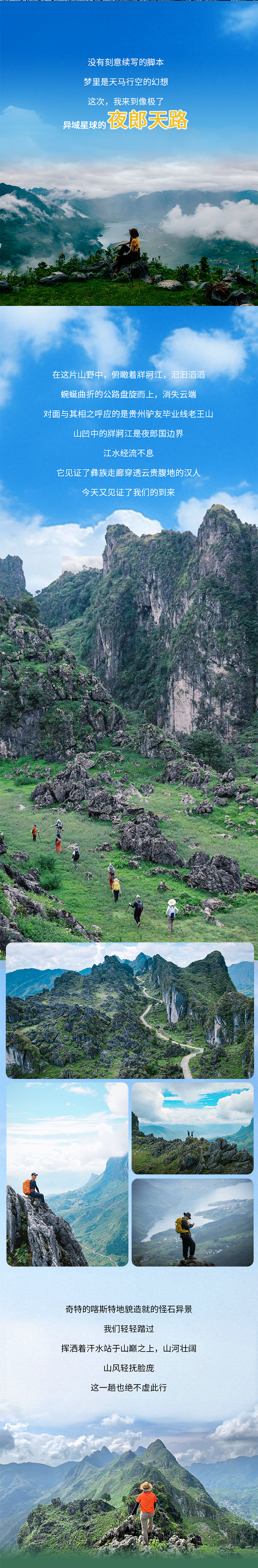 上午乘车前往夜郎天路,从山脚的乡道开始徒步,穿越村落、山脉、一路沿着羊肠小道爬升至海拔两千多米的龙脊山顶,沿途眺望牂牁江和老王山做伴。登顶后沿着“异域星球”般的山峰继续前行、拍美照凹造型。