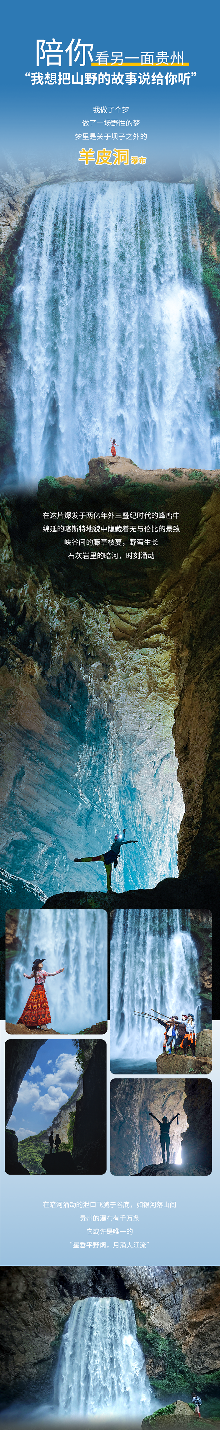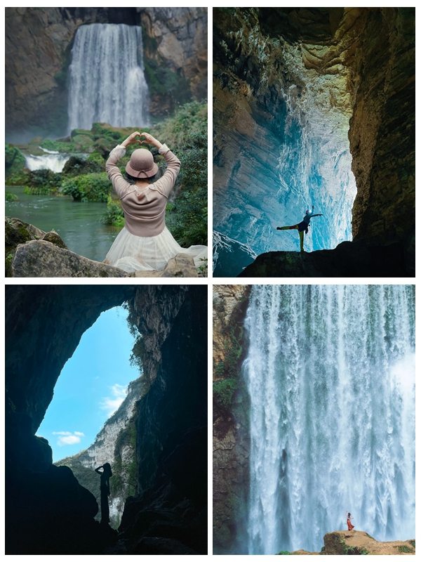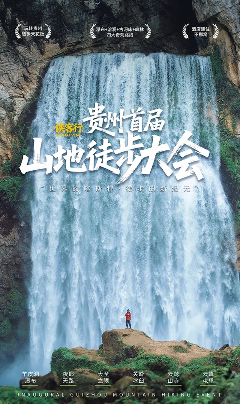 早餐后乘车前往贵州山地徒步大会活动的首个秘境“羊皮洞瀑布”,热身后徒步下至峡谷底部,欣赏“网红瀑布”羊皮洞,在瀑布前打卡拍照。