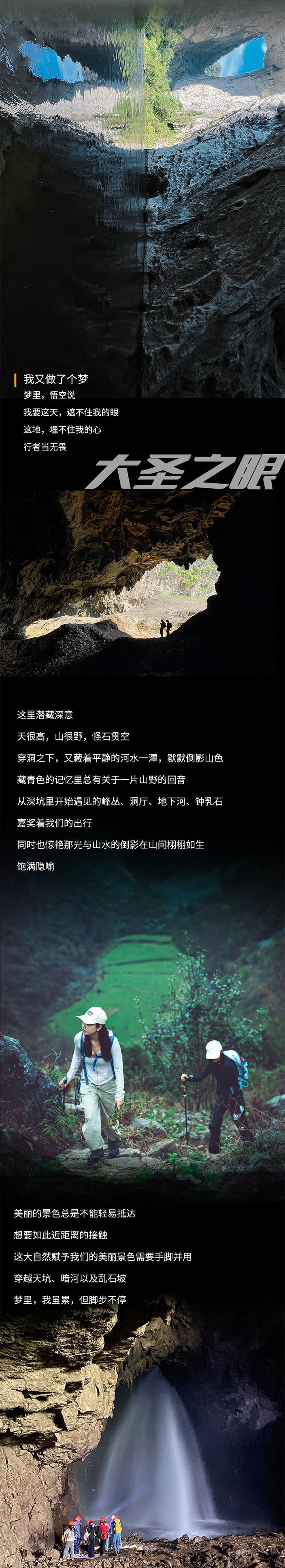 上午,乘车出发大圣之眼。抵达徒步起点简单热身运动后开始徒步行程,穿越天坑、崖洞、溶洞、地下河谷。