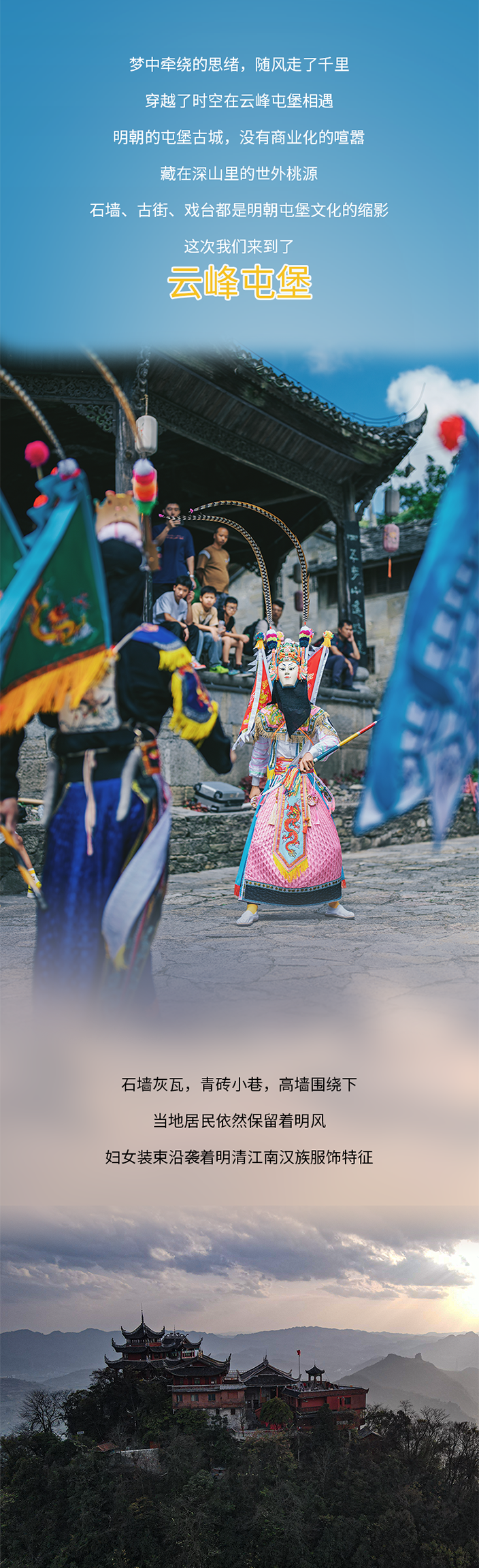 上午乘车前往云峰屯堡,走进600年的古寨,欣赏贵州“八怪”之一的石头当瓦盖,登云鹫山寺祈福、一览众山小;参观游览古宅大院,了解屯堡文化,走进屯堡人的生活场景,感受一场人文盛宴之旅。