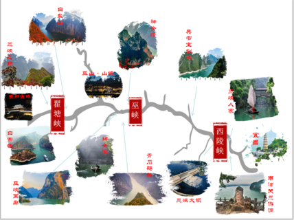 沿途两岸奇峰陡立、峭壁对峙,自东向西依次经过西陵峡、巫峡、瞿塘峡。