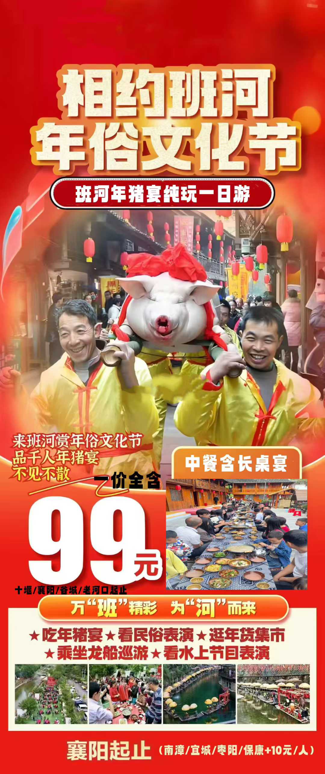 【活动费用】:成人99元/人=1天大巴车费+中餐年猪宴+班河景区游玩+导服+保险!大小同价。【费用明细】: