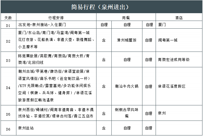 1、交通:含往返机票,到达泉州后的行程用车GPS安全监控系统旅游车配置空调旅游车(实行滚动发班,确保每人一个正座)注:行程用车视实际情况,一般正规19座以下旅游车均无行李箱