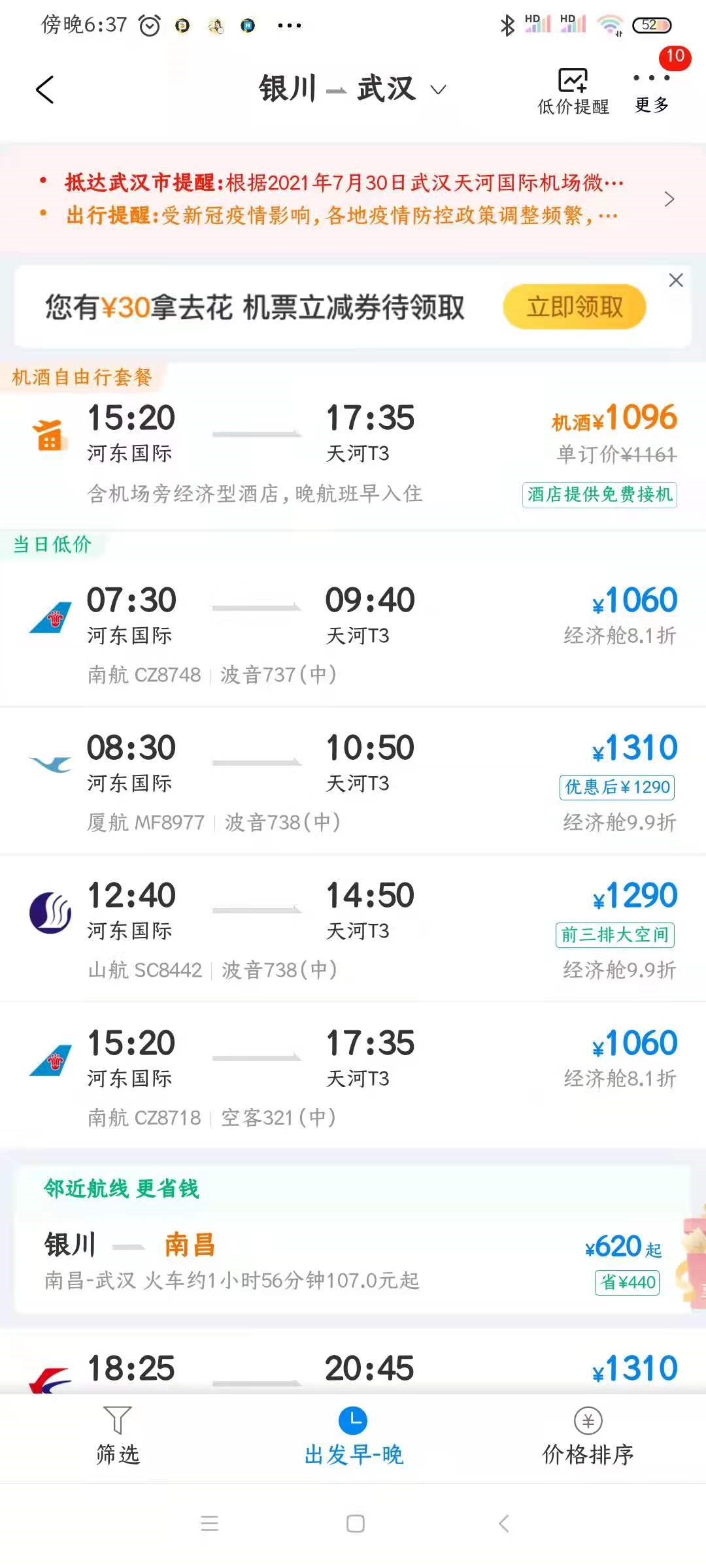 参考航班:银川-武汉(此价位仅供参考,请以实际为准。自行选择返回武汉方式,7号晚上住宿费用已含。可选择7号晚上航班,也可以选择8号航班)