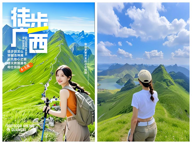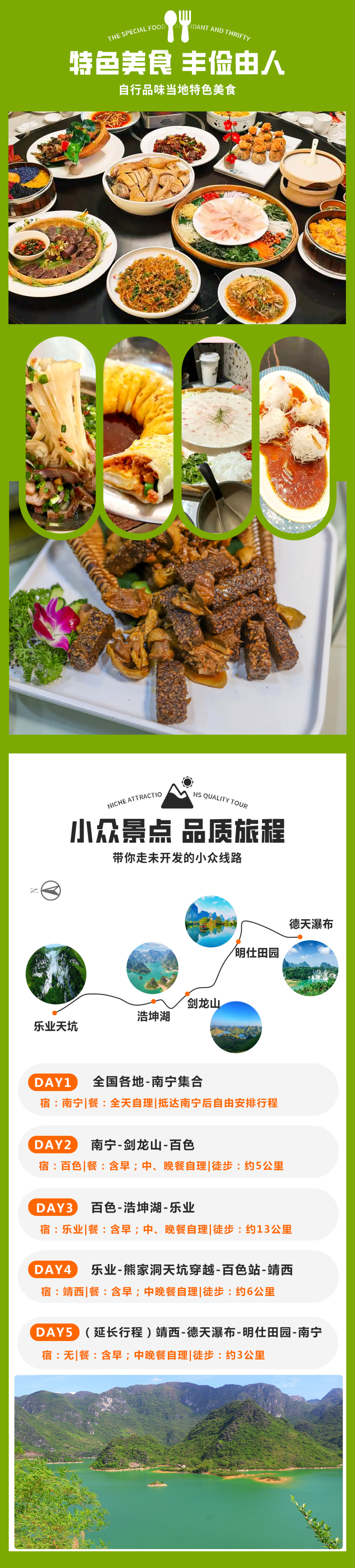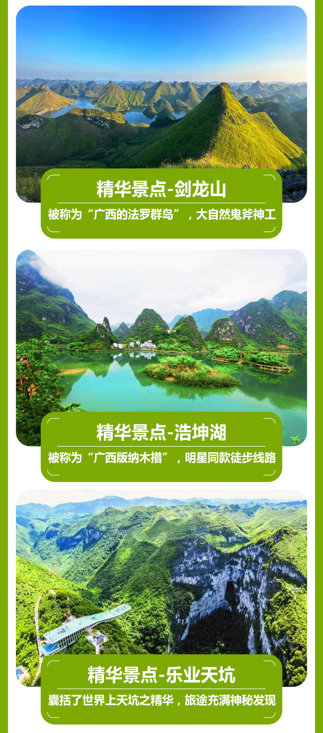 08:00早餐后出发,坐车1小时到达浩坤湖徒步起点,今天徒步网红浩坤湖穿越线,全程约13公里,爬升500米,徒步6小时左右。中午也是路餐干粮。这里也是广西山水经典的徒步景色
