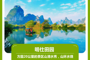 13:30【明仕田园】国家4A级景点,这里山青水秀,翠竹绕岸,山峰奇特,农舍点缀,极富南国田园气息和浓郁的壮乡风情,获得了“隐者之居”“邮票上的山水田园”等美誉。
