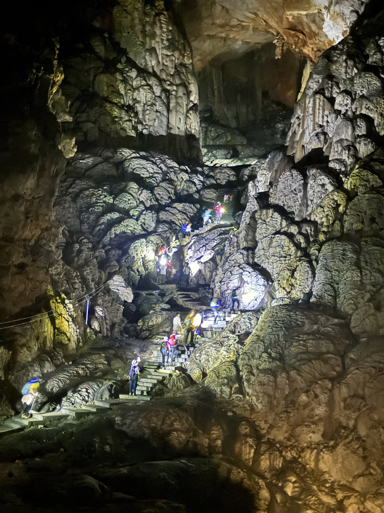 各种流石坝,美不胜收。溶洞里到处都石英砂晶石,用头灯一照,星光点点,如满天繁星