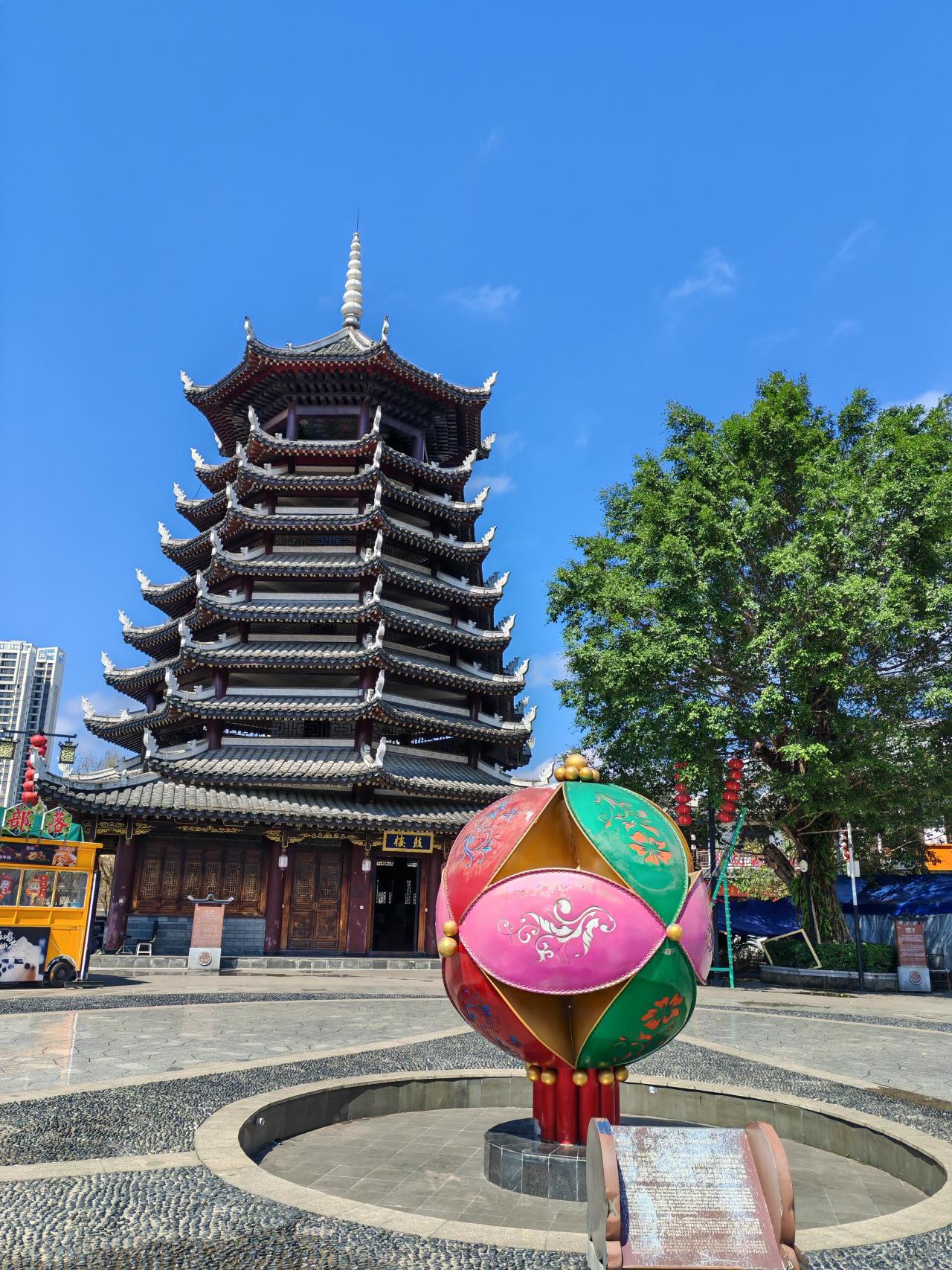 古镇上的建筑雕梁画栋,飞檐翘角,青砖黛瓦,亭台楼阁,绣球、壮锦、铜鼓等壮族元素点缀,更是锦上添花。