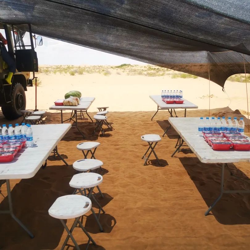 午餐之后,预计13:30左右抵达徒步起点,分发沙套、魔术头巾、登山杖等物资,之后跟随领队在沙漠徒步起点处开始做热身运动,今日徒步全天行程15公里,匀速5-6小时即可到达营地,夜宿小天鹅湖营地。