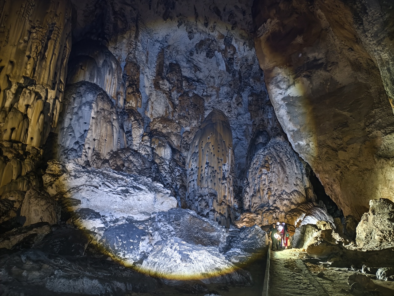 各种流石坝,美不胜收。溶洞里到处都石英砂晶石,用头灯一照,星光点点,如满天繁星