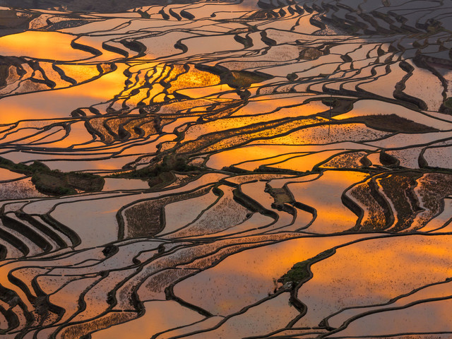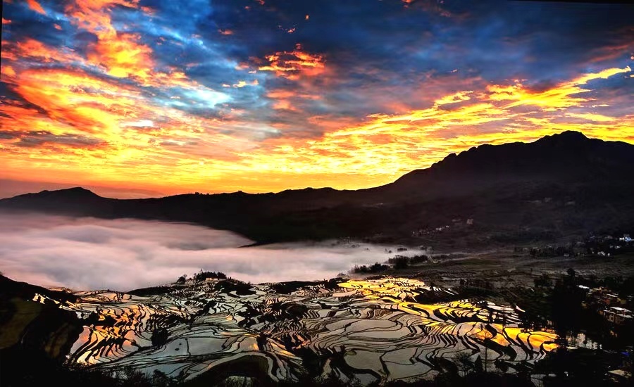 晚点前往【坝达梯田】拍摄日落。坝达景点是申报世界文化遗产核心保护之一、坝达梯田气势磅礴、面积广阔、立体感强、从海拔800米的麻栗村河起、依山而上、3700多级梯田棉不断、廷伸至海拔2000多米的高山。晚上入住元阳景区酒店。