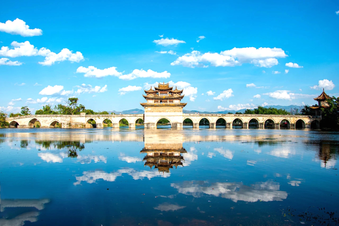 适时前往建水古城,来到【十七孔桥】,古桥一共有17孔相连,桥上还有三层楼阁,拍摄桥上天空云彩变幻和倒影,美轮美奂。接着便来一场【古城Citywalk】,打卡【朝阳楼】(朝阳楼为外观,上楼需要自费),漫步在历经沧桑的临安路上,感受古城的韵味。