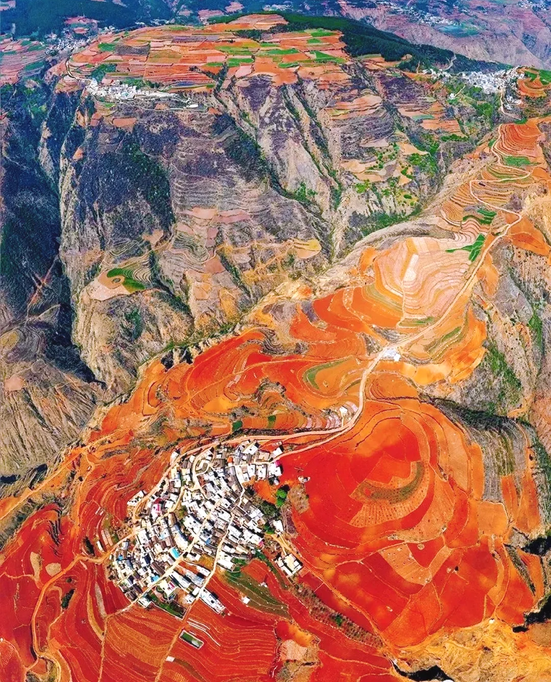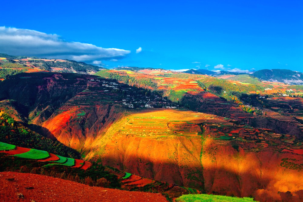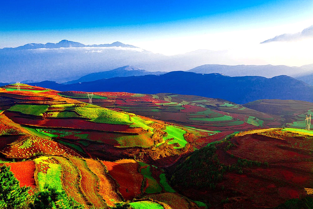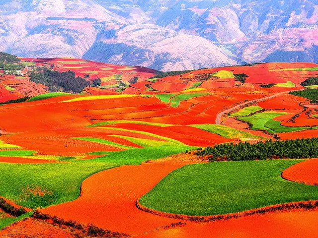 之后行车约4.5小时左右到达【东川红土地】。先沿途拍摄线条流畅的【乐谱凹】,然后前往【落霞沟】,这里的红土地上映出朵朵白云,忽明忽暗,顺光高点红土地会呈现出艳丽的光影。放眼望去,仿佛是天公涂抹的板块一样斑斓炫目。